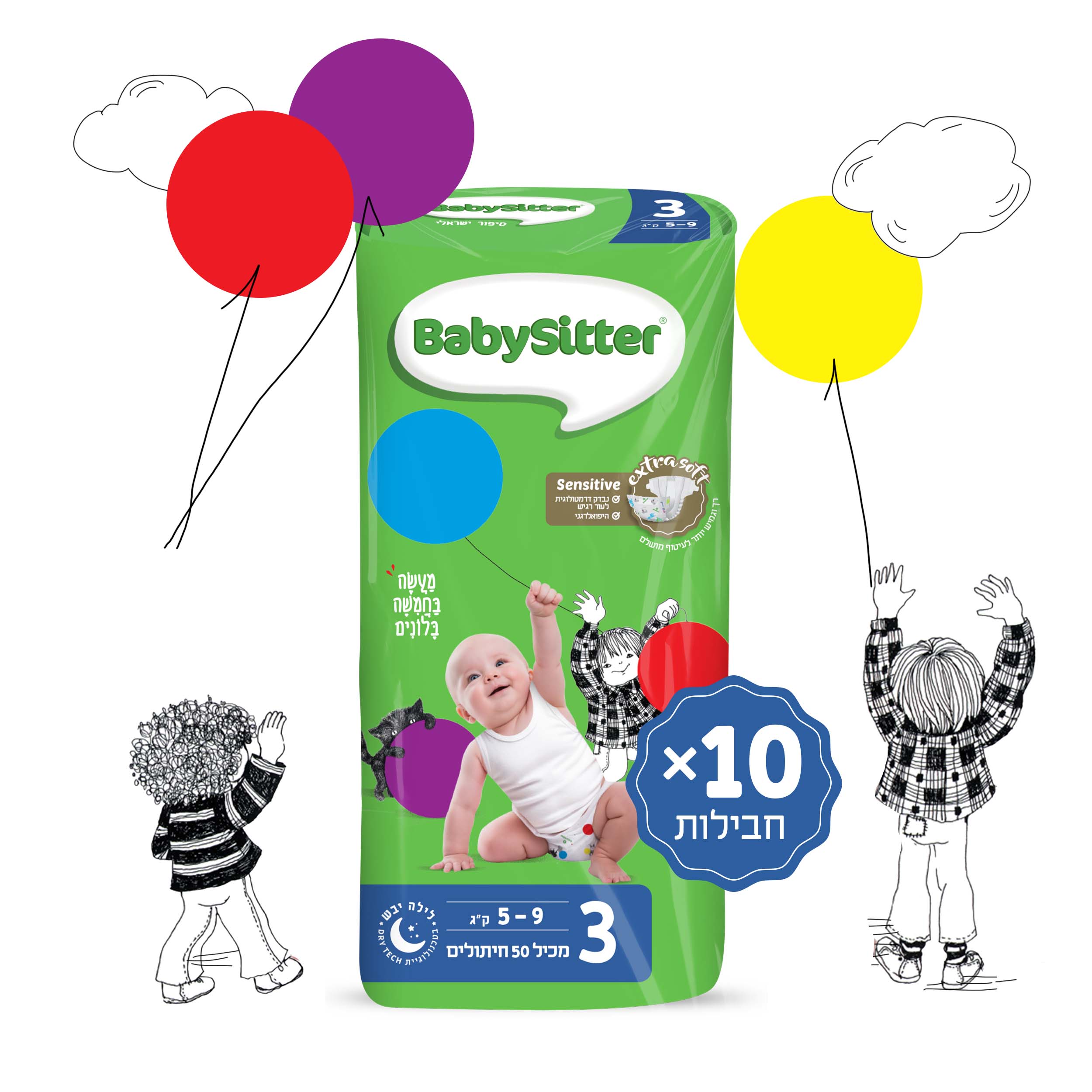10 חבילות חיתולי BabySitter מידה 3 - 30 יחידות מתאימה למשקל 5-9 ק"ג ומעוצבת בהשראת הספר "מעשה בחמישה בלונים".