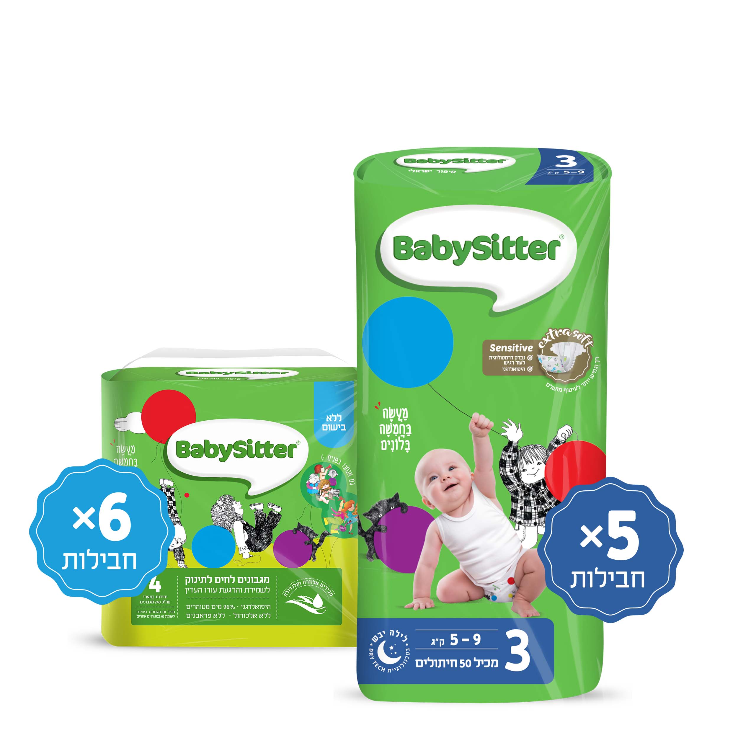 5 חבילות חיתולי BabySitter מידה 3 - 30 יחידות מתאימה למשקל 5-9 ק"ג ומעוצבת בהשראת הספר "מעשה בחמישה בלונים".