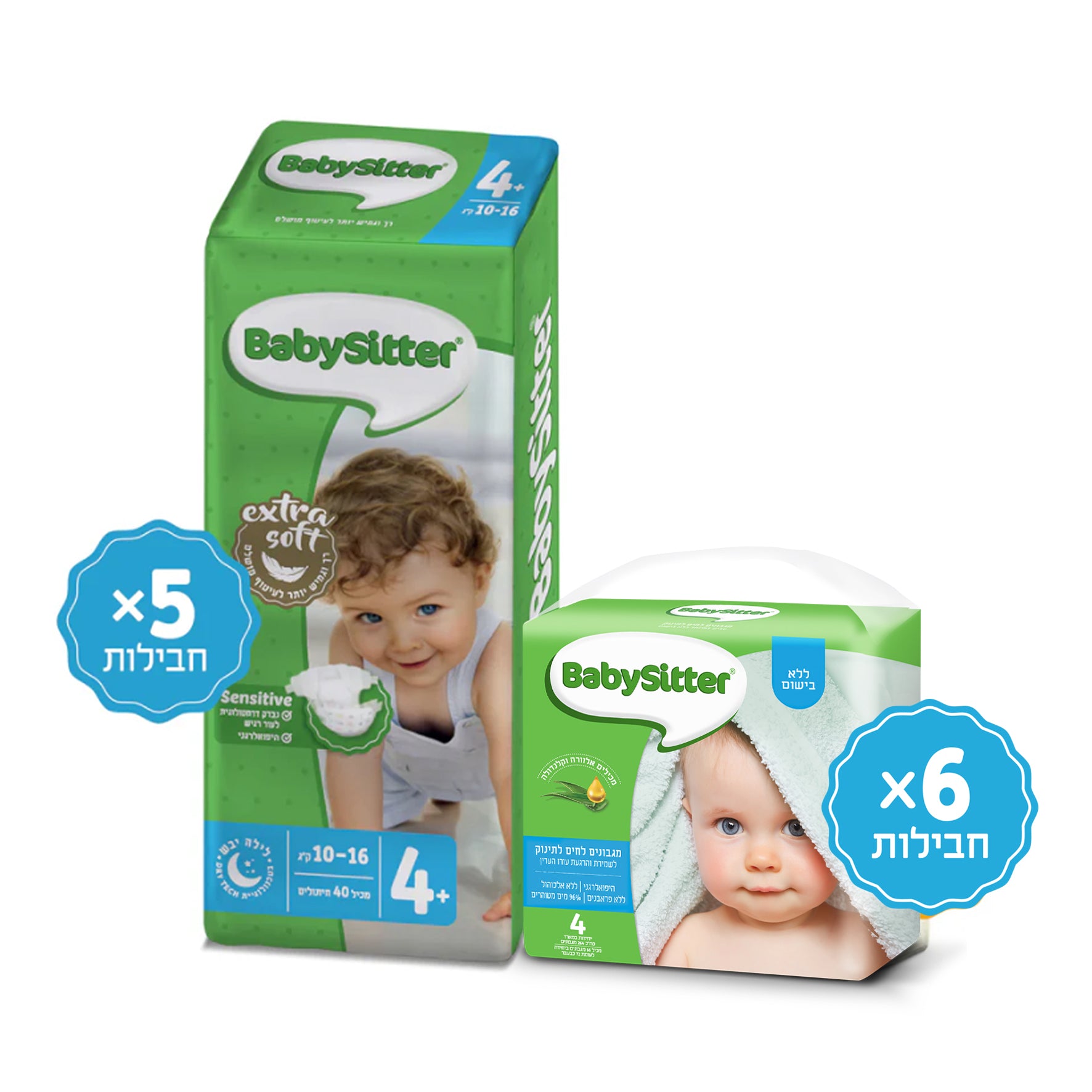 5 חב' חיתולים מידה 4 פלוס + 6 מארזי רביעיית מגבונים ללא בישום