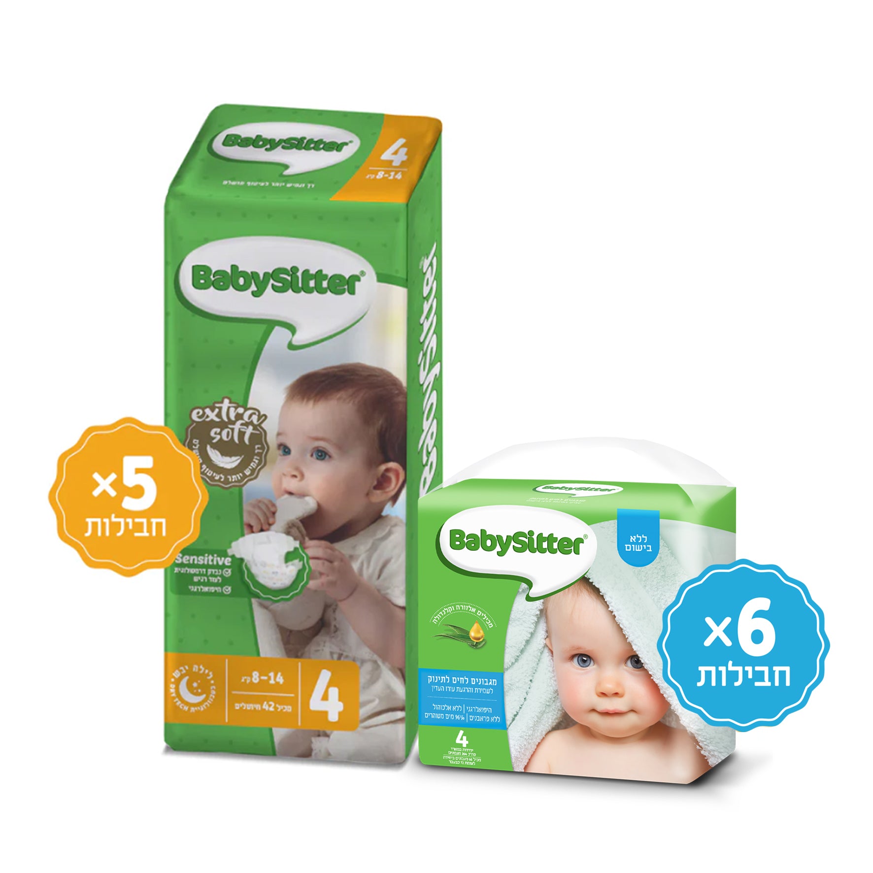 5 חב' חיתולים מידה 4 + 6 מארזי רביעיית מגבונים ללא בישום